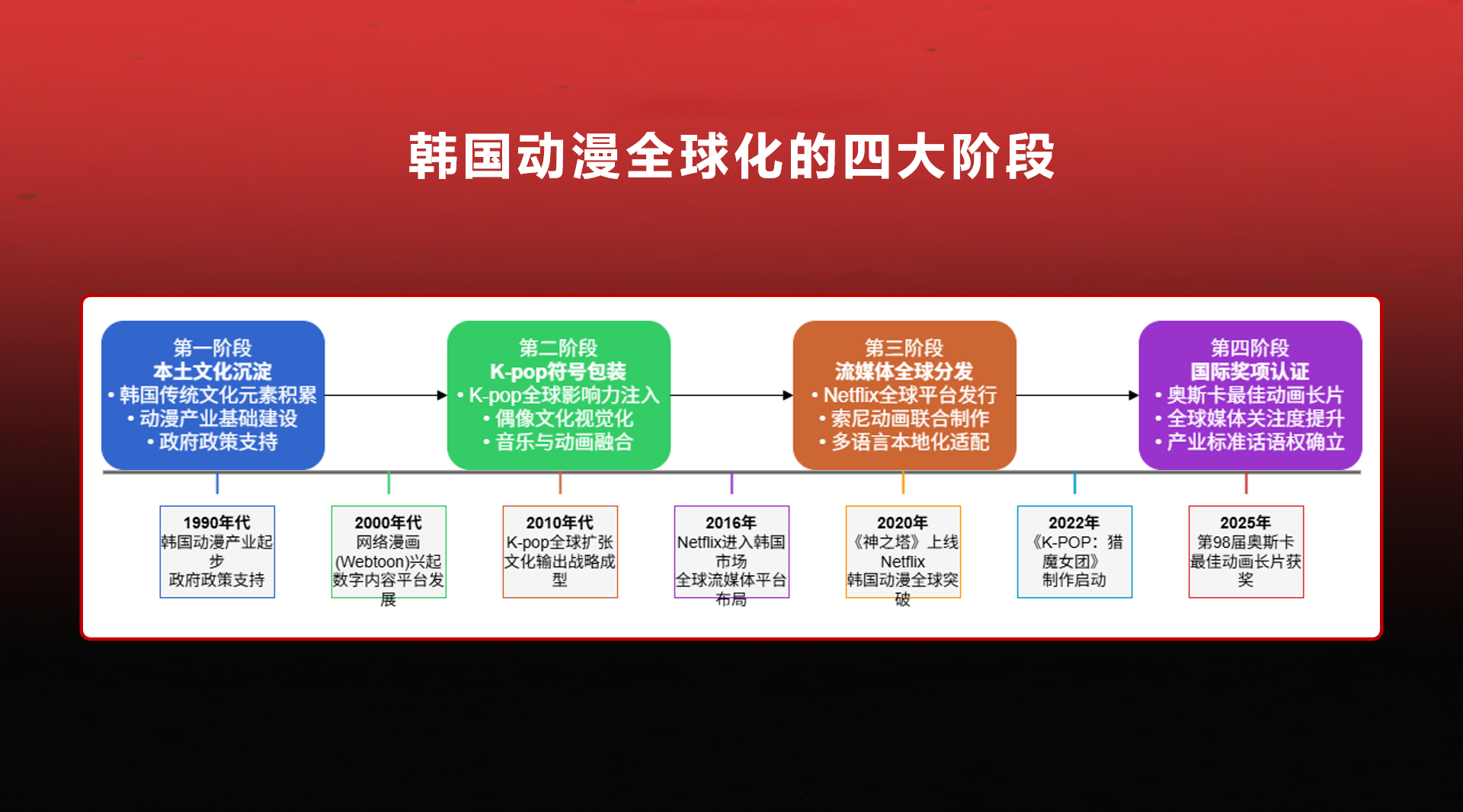 2026 年 3 月,第 98 届奥斯卡,《K-POP:猎魔女团》拿了最佳动画长片 + 最佳原创歌曲,双冠王!这是韩国第一部奥斯卡最高动画奖,也是流媒体第一次登顶奥斯卡动画长片,直接终结好莱坞二十年垄断!