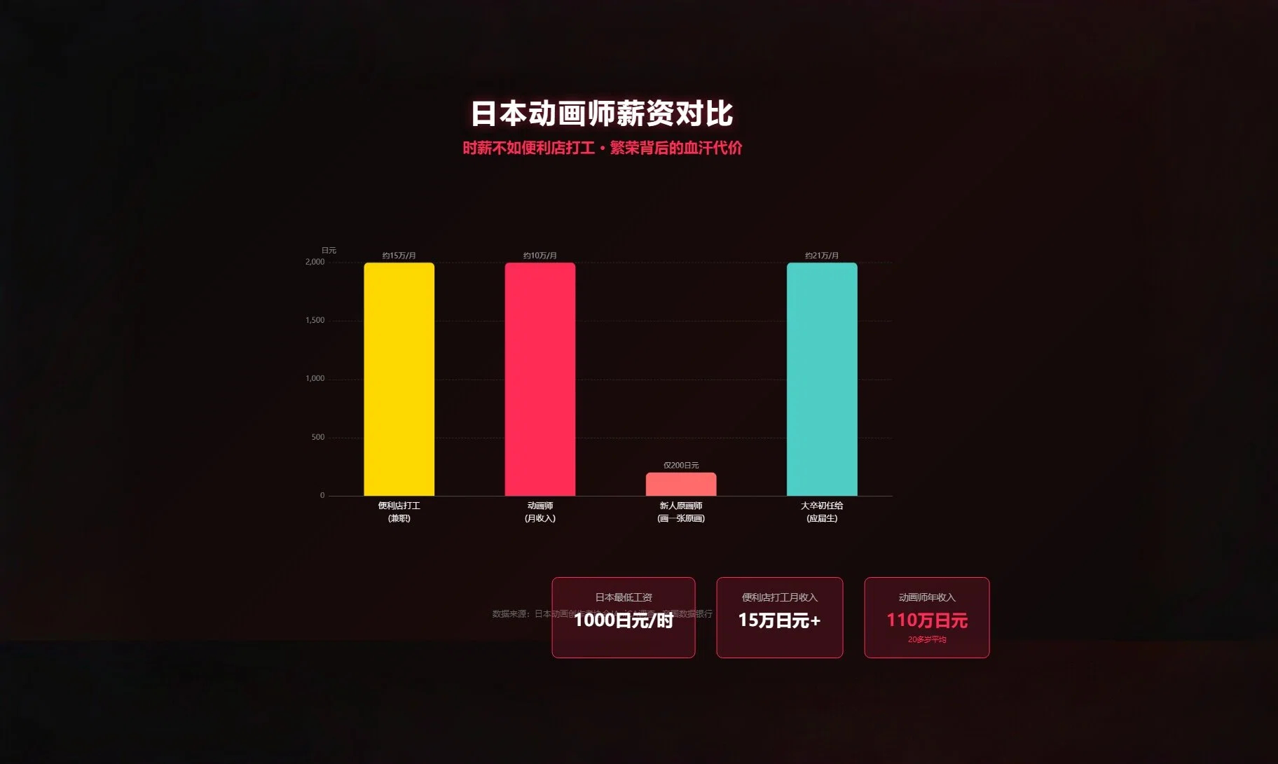 但与此同时,基层动画师的平均月薪,只有11万日元左右——大概5200块人民币。