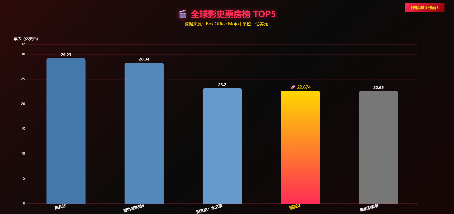 近日,国产动画《哪吒2》以154亿元人民币(约22.67亿美元)的票房登顶全球影史第四,超越《泰坦尼克号》,成为中国电影史上的又一里程碑。