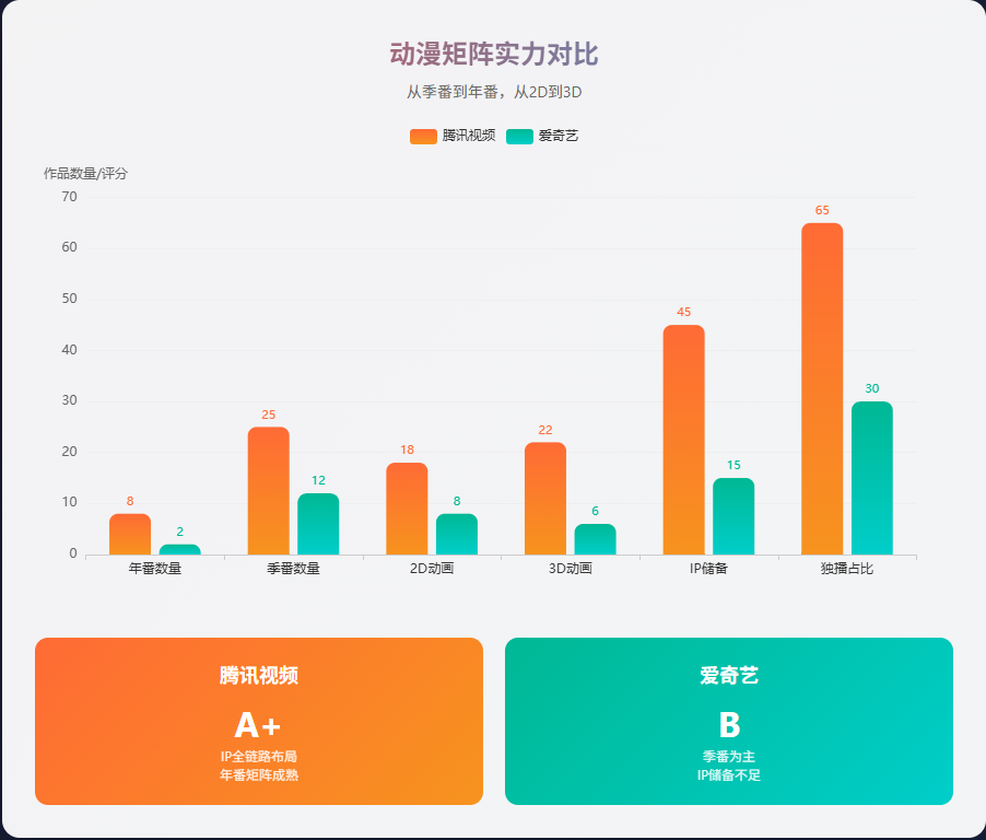 爱奇艺最近是发了几部动漫,水平参差不齐。腾讯视频早就构建起从季番到年番,从2D到3D,多元题材的作品矩阵,无论是从用户数大盘,还是从作品影响力大盘综合来看,爱奇艺还是有很大差距的。