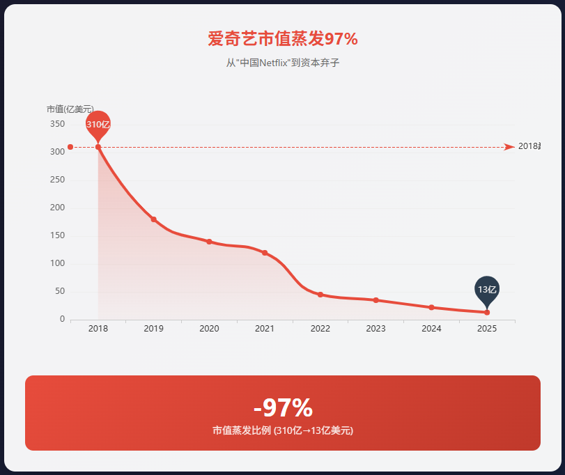 到了今年4月21日,爱奇艺股价直接崩至1.4美元。市值约13亿美元。八年时间,市值蒸发97%,折合人民币,超2180亿市值凭空消失。