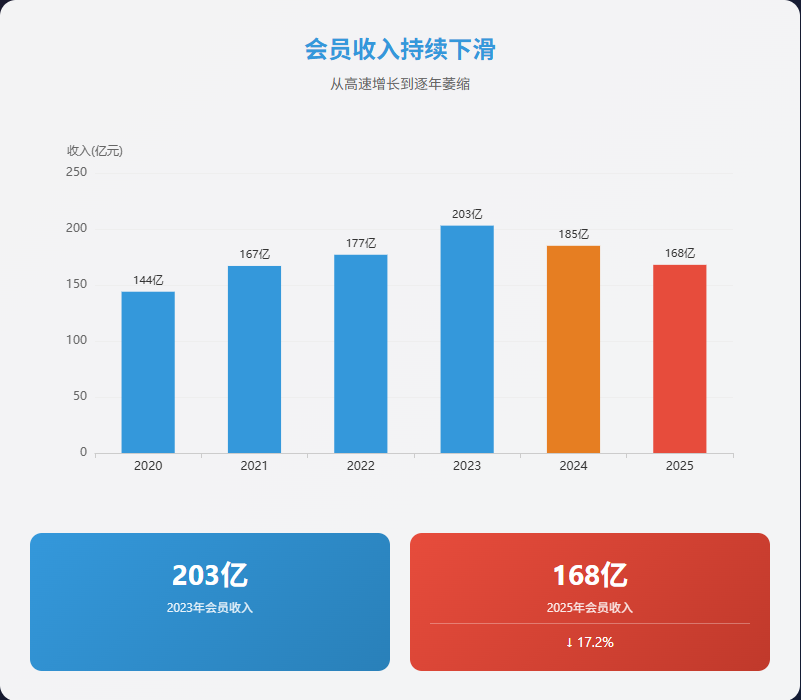 去年净亏损2亿多,由盈转亏,会员收入168亿,比两年前少了35亿。广告收入51.9亿,也缩水了近10亿。